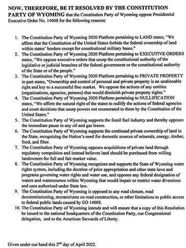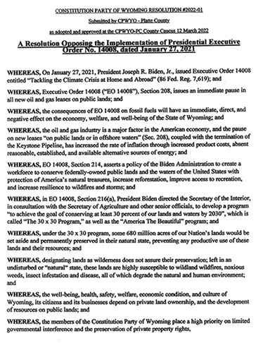 The Constitution Party of Wyoming adopted a resolution at its state convention in Evanston April 2 opposing the implementation of Presidential Executive Order No. 14008 — "Tackling the Climate Crisis at Home and Abroad."